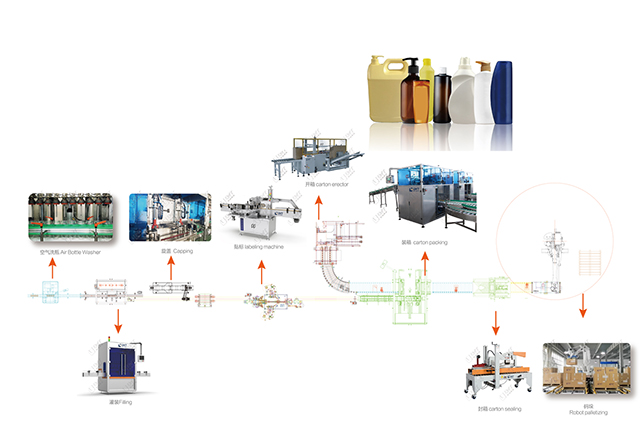日化灌裝生產線,可用于液體、膏體的灌裝,如:洗發(fā)水、洗手液、洗滌劑、洗發(fā)水、洗發(fā)乳、沐浴露等灌裝,下面以洗發(fā)水灌裝生產線為例說明。
