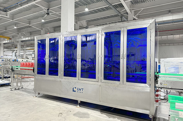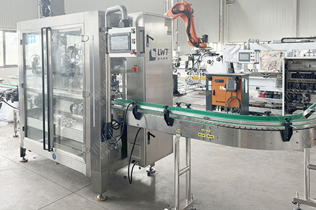灌裝——旋蓋——稱重檢測(cè)——膜包收縮——機(jī)器人碼垛——纏繞