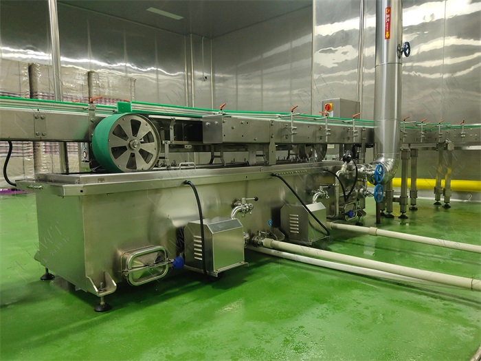清洗 -> 2. 去皮 -> 3. 打漿/破碎 -> 4. 調(diào)配 -> 5. 融糖 -> 6. 均質(zhì) -> 7. 預(yù)熱 ->8. 空罐卸垛 -> 9. 空罐清洗(高壓噴淋) -> 10. 空罐吹干/瀝干 ->11. 自動(dòng)灌裝 -> 12. 抽真空/蒸汽噴射(排除罐頂空氣) -> 13. 真空封口 ->14. 殺菌  -> 15. 冷卻 -> 16. 吹干(去除表面水漬)-> 17. 噴碼 -> 18. 貼標(biāo) -> 19. 自動(dòng)開(kāi)箱 -> 20. 自動(dòng)裝箱 -> 21. 自動(dòng)封箱 -> 22. 機(jī)器人碼垛 -> 23. 成品入庫(kù)
