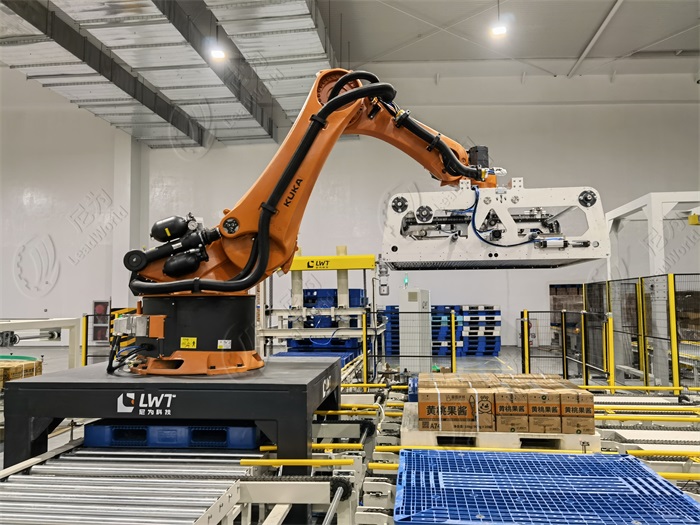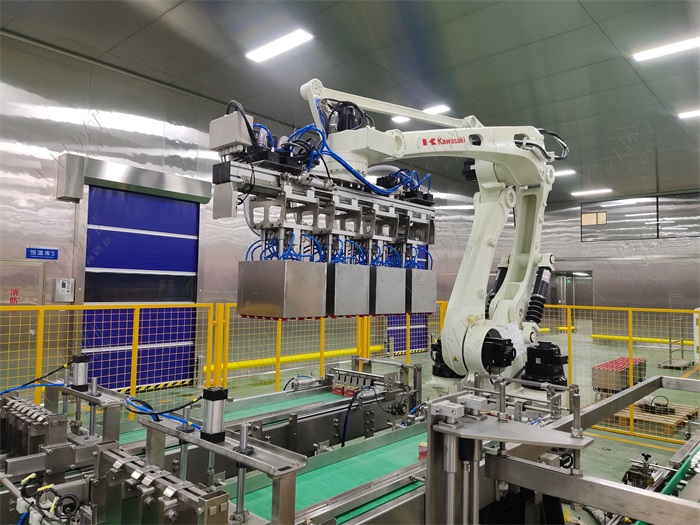 機(jī)器人碼垛機(jī)是機(jī)電一體化高新技術(shù)產(chǎn)品??砂凑找蟮木幗M方式和層數(shù),完成對(duì)料袋、膠塊、箱體等各種產(chǎn)品的碼垛。